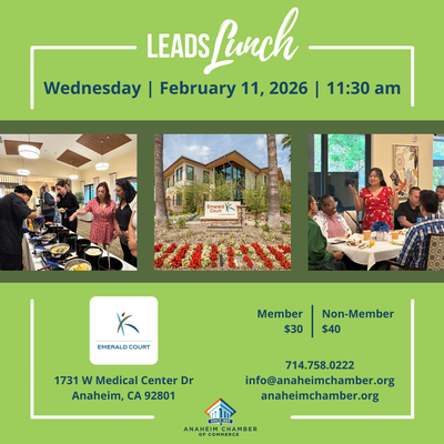 Make lunch count! Join the Anaheim Chamber of Commerce for a dynamic business networking lunch at Emerald Court in Anaheim on Wednesday, February 11, 2026.